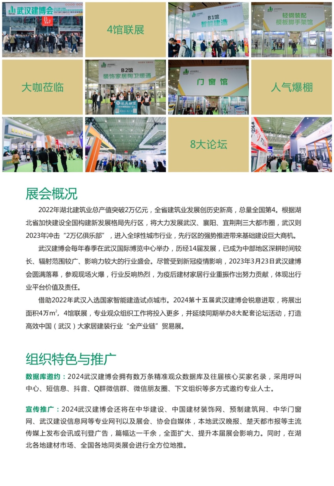 宣传推广。2024武汉建博会还将在中华建设、中国建材装饰网、预制建筑网、中华门窗网、武汉建设信息网等专业网刊以及展会、协会自媒体,本地武汉晚报、楚天都市报等主流传媒上发布会讯或刊登广告,篇幅达一千余,全面扩大、提升本届展会影响力。同时,在湖北各地建材市场、全国各地同类展会进行全方位地推。