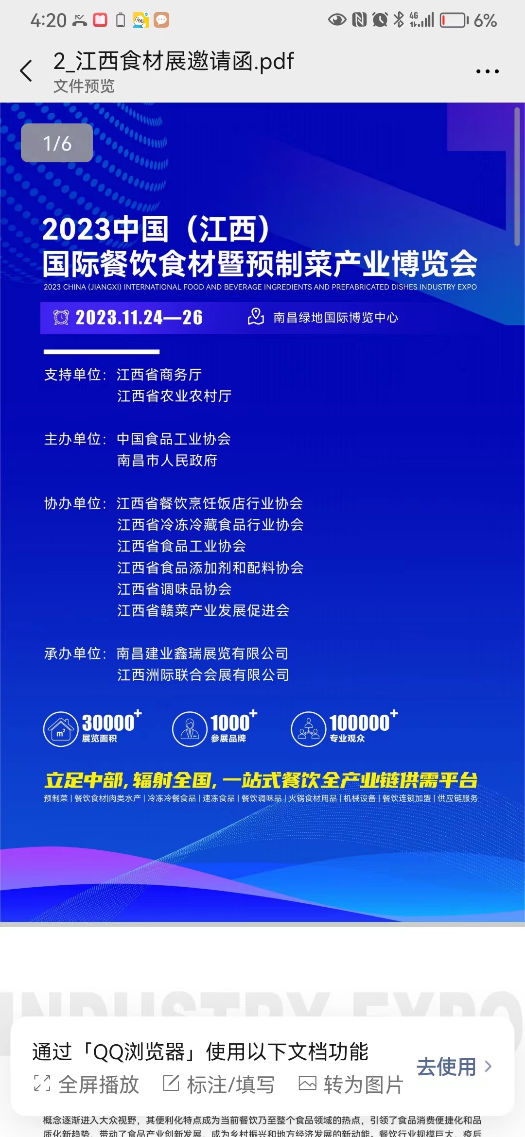 2023中国(江西)餐饮食材展暨预制菜产业博览会 展会时间:2023年11月24日-26日 展位面积:30000+ 参加品牌:1000+ 专业观众100000+ 展馆:中国 · 江西南昌绿地国际会展中心 地址:江西省南昌市红谷滩新区怀玉山大道1315号