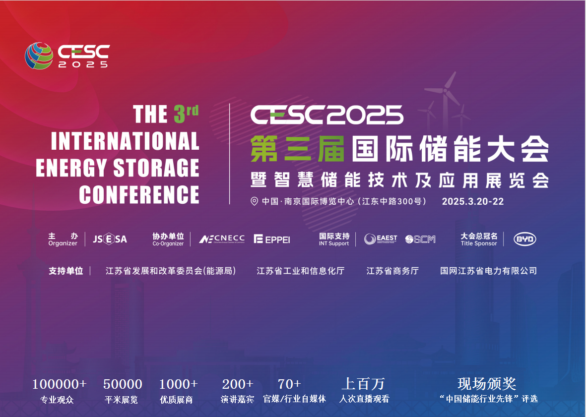 CESC2025第三届国际储能大会暨智慧储能技术及应用展览会 时间:2025年3月20-22日 地点:中国·南京国际博览中心(江东中路300号) 主办单位:江苏省储能行业协会 独家总冠名:比亚迪汽车工业股份有限公司 晚宴冠名:上能电气股份有限公司 承办单位:创能国际会展服务(江苏)有限公司