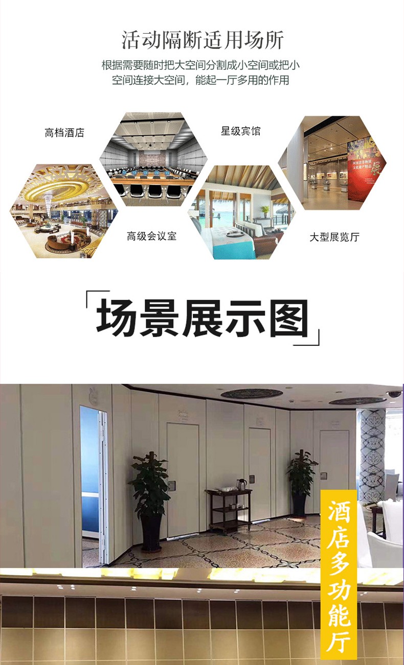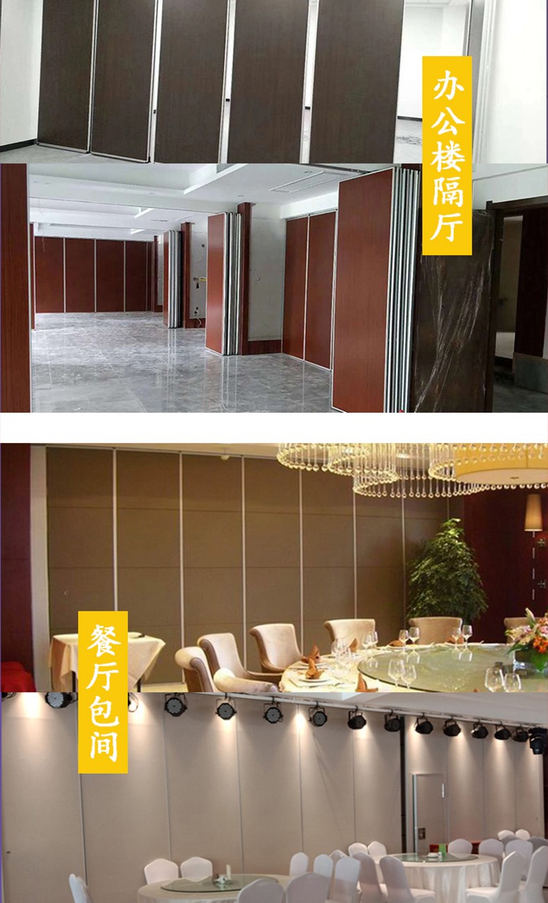 2、活动隔墙板由高硬度铝合金为框架,高强度的钢制骨架、橡胶、隔音棉及饰面板组成。