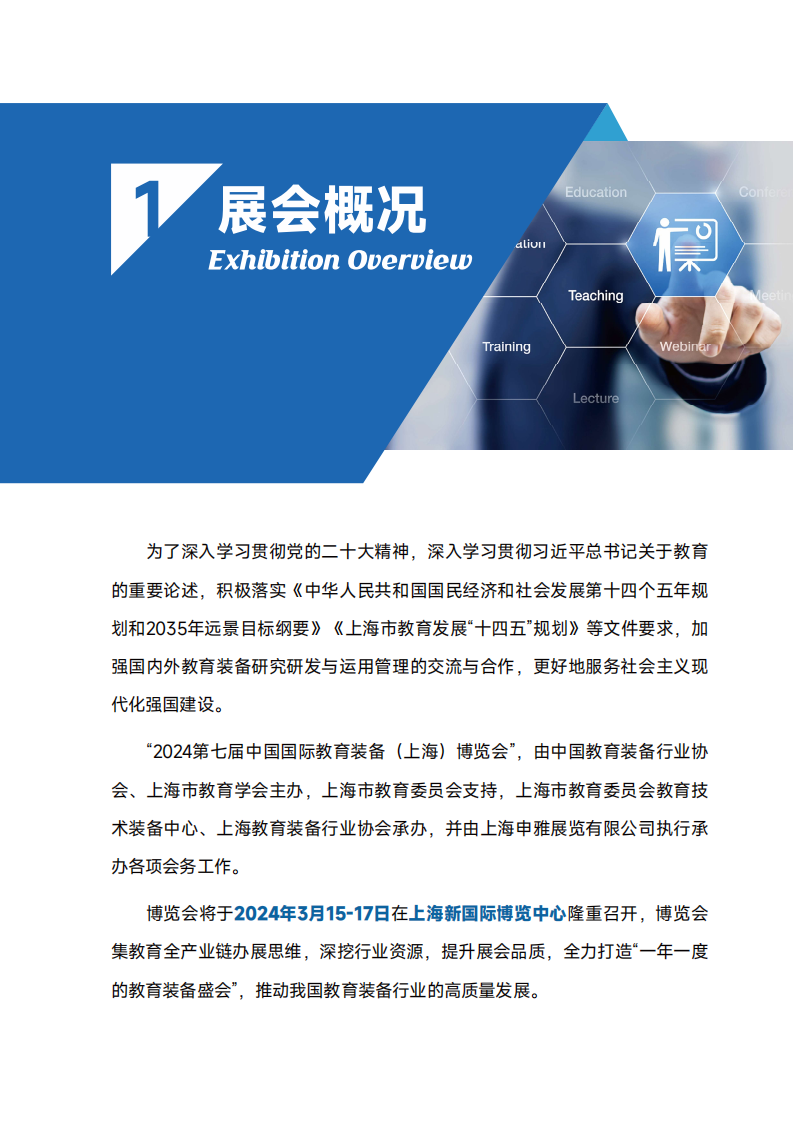 为了深入学习贯彻党的二十大精神,深入学习贯彻习近平总书记关于教育的重要论述,积极落实《中华人民共和国国民经济和社会发展第十四个五年规划和2035年远景目标纲要》《上海市教育发展“十四五”规划》等文件要求,加强国内外教育装备研究研发与运用管理的交流与合作,更好地服务社会主义现代化强国建设。“2024第七届中国国际教育装备(上海)博览会”,由中国教育装备行业协会、上海市教育学会主办,上海市教育委员会支持,上海市教育委员会教育技术装备中心、上海教育装备行业协会承办,并由上海申雅展览有限公司执行承办各项会务工作。博览会将于2024年3月15-17日在上海新国际博览中心隆重召开,博览会集教育全产业链办展思维,深挖行业资源,提升展会品质,全力打造“一年一度的教育装备盛会”,推动我国教育装备行业的高质量发展。